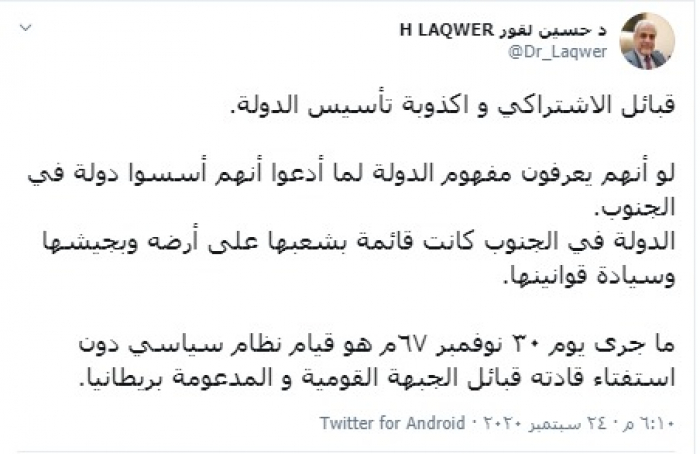واختتم "لقور" تغريدته قائلاً: "ما جرى يوم ٣٠ نوفمبر ٦٧م هو قيام نظام سياسي دون استفتاء قادته قبائل الجبهة القومية و المدعومة بريطانيا".