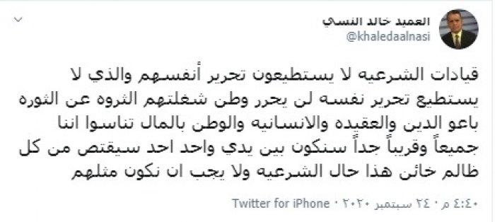 وكتب "النسي" تغريدة عبر تويتر، رصدها "المشهد العربي": "قيادات الشرعية لا يستطيعون تحرير أنفسهم والذي لا يستطيع تحرير نفسه لن يحرر وطن شغلتهم الثروة عن الثورة باعوا الدين والعقيدة والإنسانية والوطن بالمال تناسوا أننا جميعا وقريبا جدا سنكون بين يدي واحد أحد سيقتص من كل ظالم خائن هذا حال الشرعية ولا يجب أن نكون مثلهم".