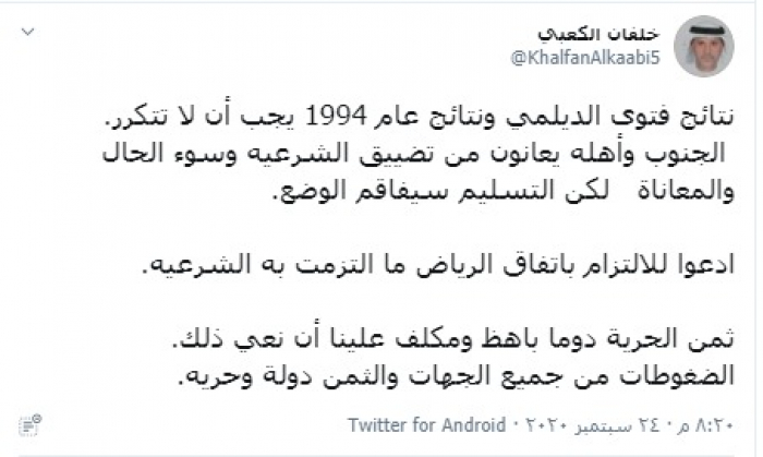 الحرية ثمنها باهظ.. الكعبي يوجه رسالة للجنوبيين