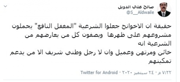 وكتب "الدويل" تغريدة عبر تويتر، رصدها "المشهد العربي": "حقيقة أن الإخوانج جعلوا الشرعية "المغفل النافع" يحملون مشروعهم على ظهرها".