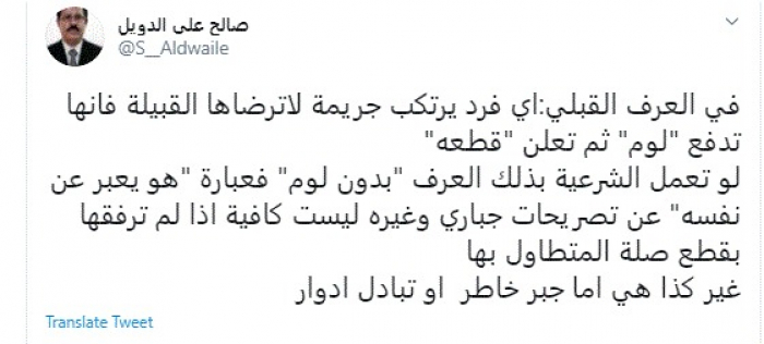 وقال في تغريدة عبر "تويتر" رصدها "المشهد العربي": "في العرف القبلي: أي فرد يرتكب جريمة لا ترضاها القبيلة فإنها تدفع لوم ثم تعلن قطعه".
