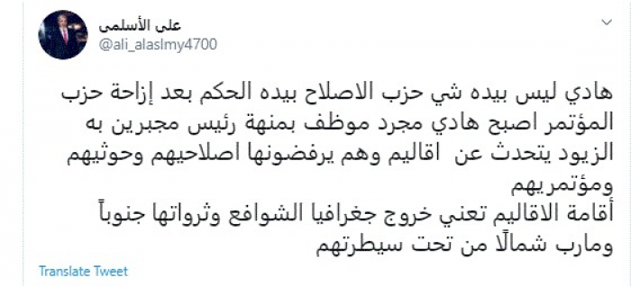 الأسلمي: حزب الإصلاح يحكم اليمن.. وهادي مجرد موظف بمهنة رئيس
