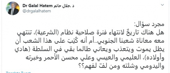 وقال في تغريدة عبر "تويتر" رصدها "المشهد العربي": "مجرد سؤال: هل هناك تاريخٌ لانتهاء فنرة صلاحية نظام (الشرعية)، تنتهي معه معاناة شعبنا الجنوبي..أم أنه كُتِبَ على هذا الشعب أن يظل يموت ويتعذب ويعاني طالما بقي في السلطة (هادي وأولاده)، العليمي والعيسي وعلي محسن الأحمر وخبرته واليدومي وشلته ومن لفّ لفهم؟؟".