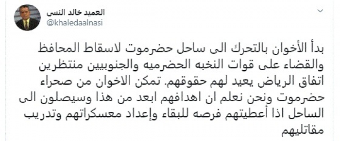 وقال في تغريدة عبر "تويتر" رصدها "المشهد العربي": "بدأ الإخوان بالتحرك إلى ساحل حضرموت لإسقاط المحافظ والقضاء على قوات النخبة الحضرمية والجنوبيين منتظرين اتفاق الرياض يعيد لهم حقوقهم".