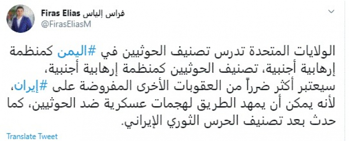 علق الباحث السياسي العراقي فراس إلياس، اليوم، على دراسة الإدارة الأمريكية لتصنيف مليشيات الحوثي كمنظمة إرهابية.