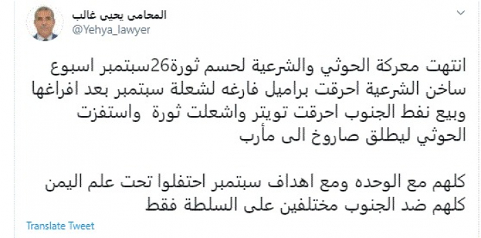 وكتب في تغريدة عبر "تويتر" رصدها "المشهد العربي": "انتهت معركة الحوثي والشرعية لحسم ثورة 26سبتمبر أسبوع ساخن الشرعية أحرقت براميل فارغة لشعلة سبتمبر بعد إفراغها وبيع نفط الجنوب أحرقت تويتر وأشعلت ثورة واستفزت الحوثي ليطلق صاروخ إلى مأرب".