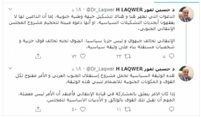 وكتب "لقور" تغريدة عبر تويتر، رصدها "المشهد العربي": "الدعوات التي تظهر هنا وهناك لتشكيل جبهة وطنية جنوبية، إما أن الداعين لها لا يفقهون أبجديات التشكيلات السياسية، أو أنها دعوة مبيتة لتحجيم مشروع المجلس الانتقالي الجنوبي".