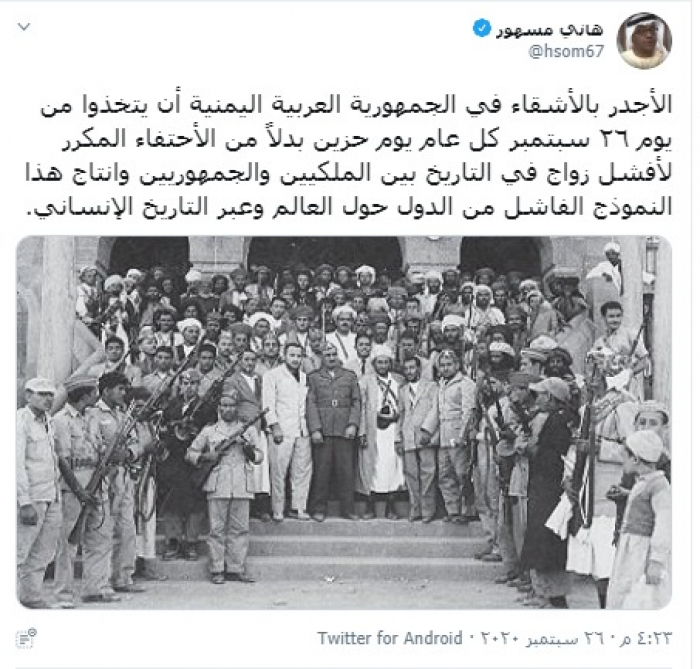 وكتب "مسهور" تغريدة عبر تويتر، رصدها "المشهد العربي": "الأجدر بالأشقاء في الجمهورية العربية اليمنية أن يتخذوا من يوم ٢٦ سبتمبر ، كل عام يوما حزينا بدلا من الاحتفاء المكرر لأفشل زواج في التاريخ بين الملكيين والجمهوريين وإنتاج هذا النموذج الفاشل من الدول حول العالم وعبر التاريخ الإنساني".