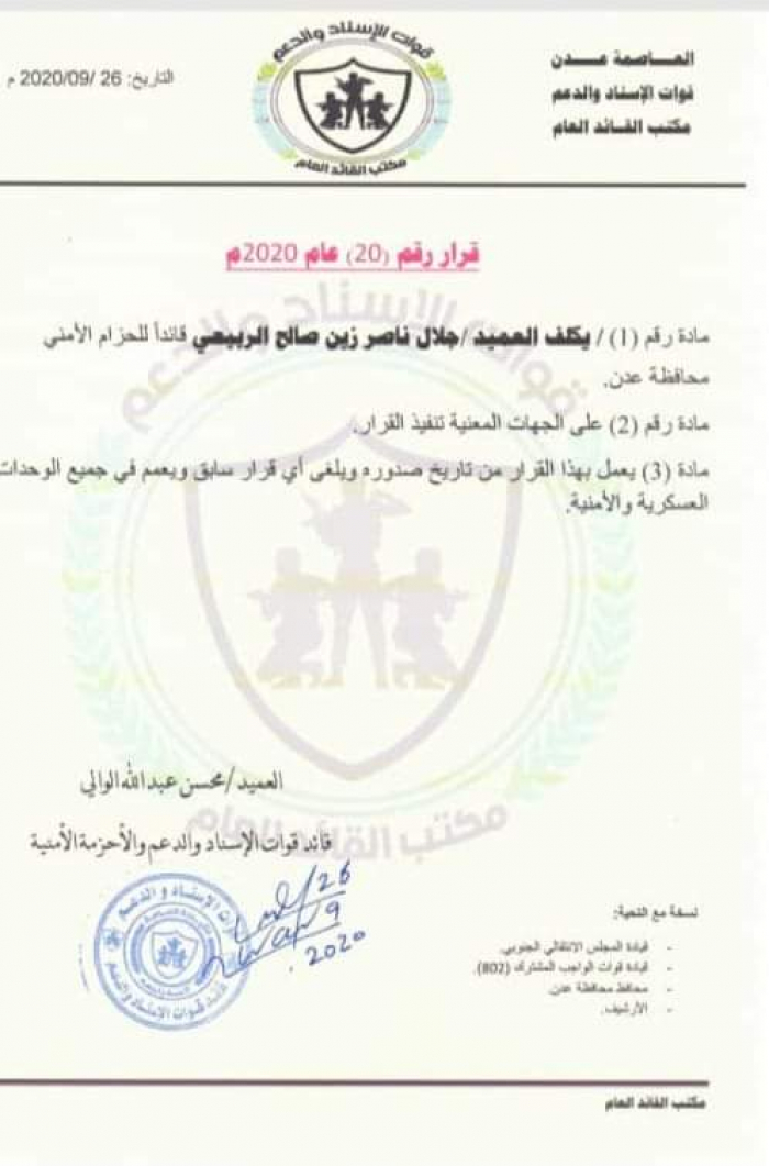 قررت قيادة قوات الأحزمة الأمنية، تكليف العميد جلال الربيعي، قائدا للحزام الأمني في العاصمة عدن.