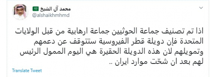 وكتب في تغريدة عبر "تويتر" رصدها "المشهد العربي": "إذا تم تصنيف جماعة الحوثيين جماعة إرهابية من قبل الولايات المتحدة فإن دويلة قطر الفيروسية ستتوقف عن دعمهم وتمويلهم لأن هذه الدويلة .... هي اليوم الممول الرئيس لهم بعد أن شحّت موارد إيران".
