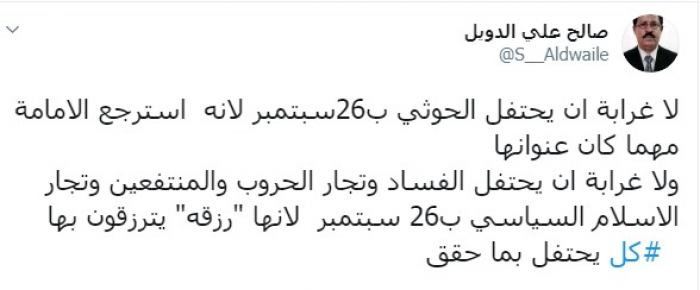 وكتب عبر تغريدة له على "تويتر" رصدها " المشهد العربي": "لا غرابة أن يحتفل الحوثي بـ26سبتمبر لأنه استرجع الإمامة مهما كان عنوانها، ولا غرابة أن يحتفل الفساد وتجار الحروب والمنتفعين وتجار الإسلام السياسي بـ26 سبتمبر لأنها "رزقه" يترزقون بها، كل يحتفل بما حقق".