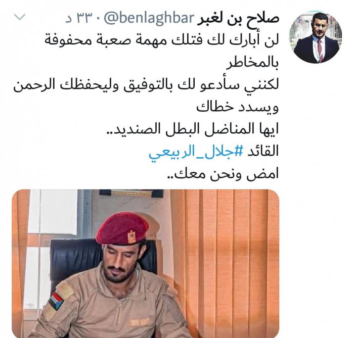 عبر الإعلامي صلاح بن لغبر، عن دعمه لتكليف العميد جلال الربيعي، قائدا للحزام الأمني في العاصمة عدن.