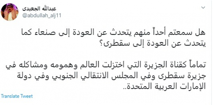 وقال في تغريدة عبر "تويتر" رصدها "المشهد العربي": "هل سمعتم أحدًا منهم يتحدث عن العودة إلى صنعاء كما يتحدث عن العودة إلى سقطرى؟".