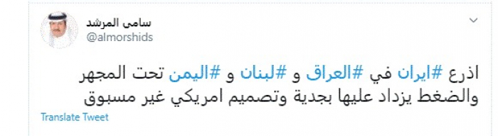 وكتب في تغريدة عبر "تويتر" رصدها "المشهد العربي": "أذرع إيران في العراق ولبنان واليمن تحت المجهر والضغط يزداد عليها بجدية وتصميم أمريكي غير مسبوق".