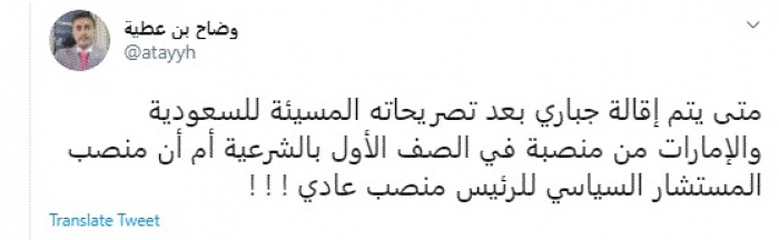 وقال في تغريدة عبر "تويتر" رصدها "المشهد العربي": "متى يتم إقالة جباري بعد تصريحاته المسيئة للسعودية والإمارات من منصبة في الصف الأول بالشرعية أم أن منصب المستشار السياسي للرئيس منصب عادي".