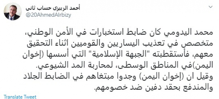 وقال في تغريدة عبر "تويتر" رصدها "المشهد العربي": "محمد اليدومي كان ضابط استخبارات في الأمن الوطني، متخصص في تعذيب اليساريين والقوميين أثناء التحقيق معهم، فاستقطبته الجبهة الإسلامية التي أسسها (إخوان اليمن) في المناطق الوسطى، لمحاربة المد الشيوعي".
