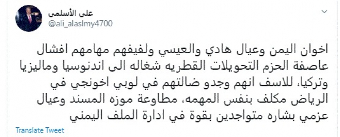 وقال في تغريدة عبر "تويتر" رصدها "المشهد العربي": "إخوان اليمن وعيال هادي والعيسي ولفيفهم مهامهم إفشال عاصفة الحزم".