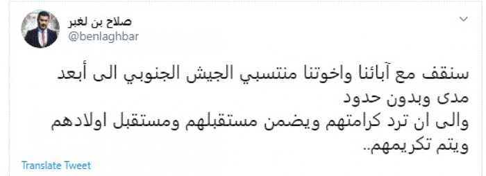 أعلن الإعلامي صلاح بن لغبر، اليوم، مساندته لمنتسبي الجيش الجنوبي لأبعد مدى وبدون حدود.