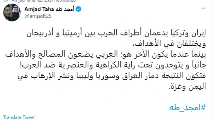 وقال في تغريدة عبر "تويتر" رصدها "المشهد العربي": "إيران وتركيا يدعمان أطراف الحرب بين أرمينيا وأذربيجان ويختلفان في الأهداف".