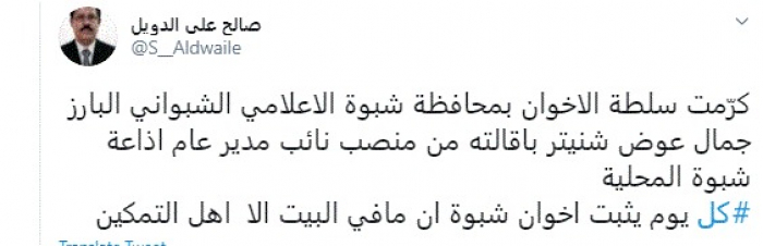 وقال في تغريدة عبر "تويتر" رصدها "المشهد العربي": "كرّمت سلطة الإخوان بمحافظة شبوة الإعلامي الشبواني البارز جمال عوض شنيتر بإقالته من منصب نائب مدير عام إذاعة شبوة المحلية كل يوم يثبت إخوان شبوة أن ما في البيت إلا أهل التمكين".