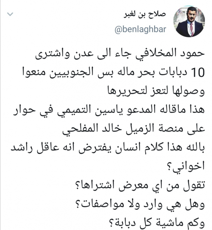 وقال بن لغبر في تغريدة له عبر حسابه بتويتر ورصدها "المشهد العربي": حمود المخلافي جاء إلى عدن واشترى 10 دبابات بحر ماله لكن الجنوبيين منعوا وصولها لتعز لتحريرها هذا ماقاله المدعو ياسين التميمي في حوار على منصة الزميل خالد المفلحي".