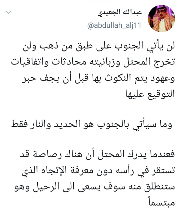 وكتب الجعيدي عبر تغريدة له على "تويتر" رصدها "المشهد العربي": "لن يأتي الجنوب على طبق من ذهب ولن تخرج المحتل وزبانيته محادثات واتفاقيات وعهود يتم النكوث بها قبل أن يجف حبر التوقيع عليها، وما سيأتي بالجنوب هو الحديد والنار فقط".