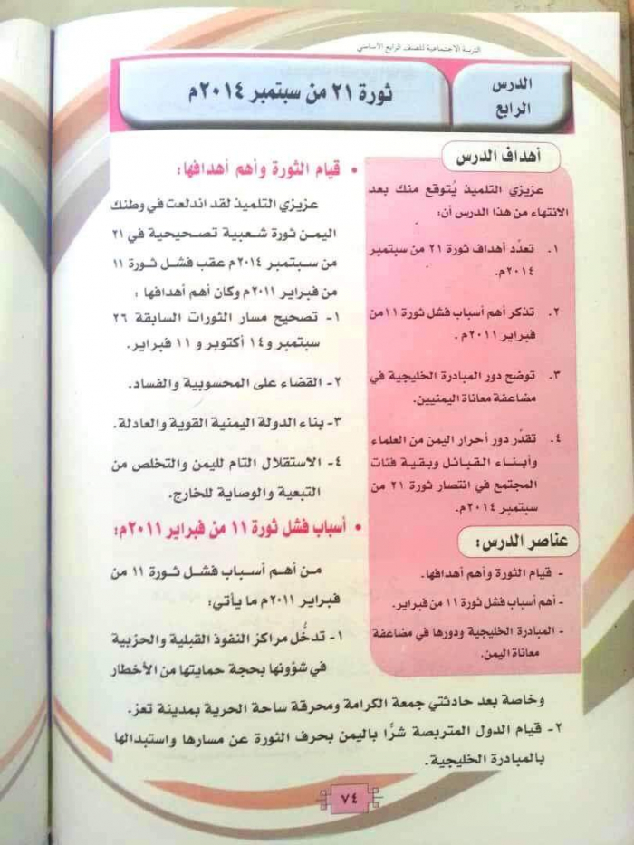 وقال مصدر تربوي في صنعاء إن التعديلات الجديدة شملت مناهج الصف الرابع الأساسي، لافتًا إلى أن من بين الدروس الجديدة، موضوع حول أهداف عدوان المليشيا في 21 سبتمبر 2014، الذي عرفته بأنه "الثورة الشعبية التصحيحية لمسار ثورات 26 سبتمبر، و14 أكتوبر، و11 فبراير"، والتي وصفها التعديل الحوثي بالفاشلات.