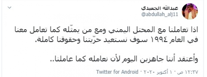 وكتب "الجعيدي" تغريدة عبر تويتر، رصدها "المشهد العربي": "إذا تعاملنا مع المحتل اليمني ومع من يمثّله كما تعامل معنا في العام 1994 سوف نستعيد حرّيتنا وحقوقنا كاملة".