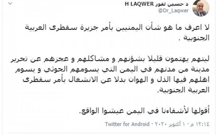 وكتب "لقور" تغريدة عبر تويتر، رصدها "المشهد العربي" قال فيها: "لا اعرف ما هو شأن اليمنيين بأمر جزيرة سقطرى العربية الجنوبية".