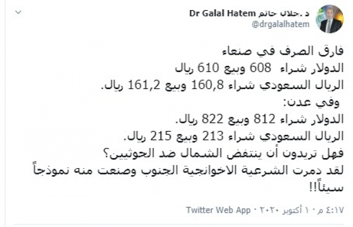 وكتب "حاتم" تغريدة عبر تويتر، رصدها "المشهد العربي": "فارق الصرف في صنعاء: