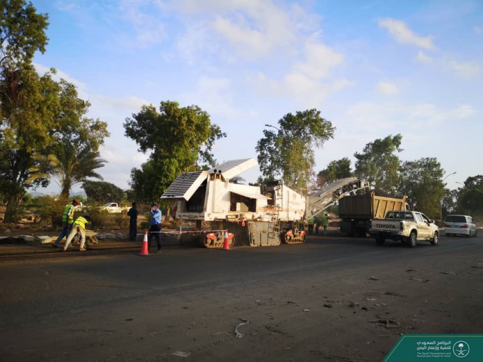 واصل البرنامج السعودي للتنمية والإعمار، جهوده في إعادة تأهيل طريق كالتكس - الحسوة بطول أربعة كيلو مترات ونصف الكيلو متر، في العاصمة عدن.