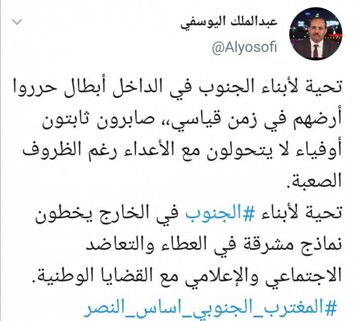 وأضاف اليوسفي تحت هاشتاق #المغترب_الجنوبي_اساس_النصر: "تحية لأبناء الجنوب في الخارج يخطون نماذج مشرقة في العطاء والتعاضد الاجتماعي والإعلامي مع القضايا الوطنية".
