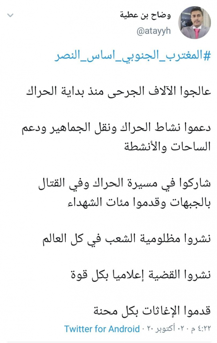 وكتب بن عطية عبر تغريدة له على "تويتر" رصدها " المشهد العربي": "عالجوا آلاف الجرحى منذ بداية الحراك، دعموا نشاط الحراك ونقل الجماهير ودعم الساحات والأنشطة، وشاركوا في مسيرة الحراك وفي القتال بالجبهات وقدموا مئات الشهداء".