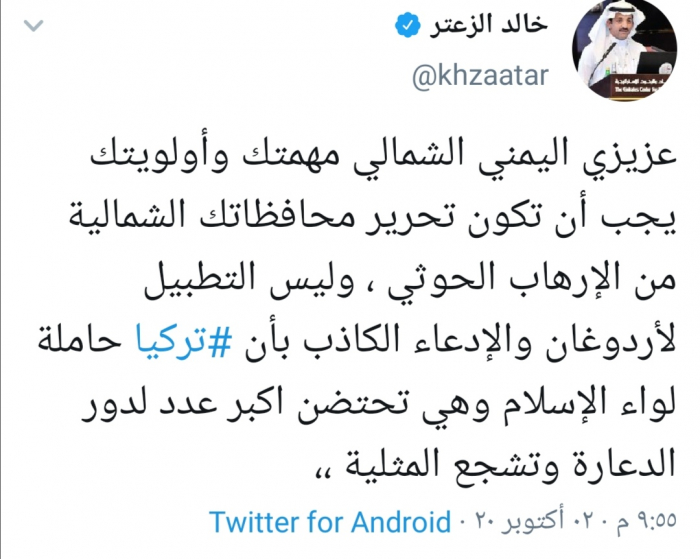 وقال الزعتر في تغريدة له عبر حسابه بتويتر ورصدها "المشهد العربي": "عزيزي اليمني الشمالي مهمتك وأولوياتك يجب أن تكون تحرير محافظاتك الشمالية من الإرهاب الحوثي ، وليس التطبيل لأردوغان والإدعاء الكاذب بأن تركيا حاملة لواء الإسلام وهي تحتضن أكبر عدد لدور ... وتشجع المثلية".
