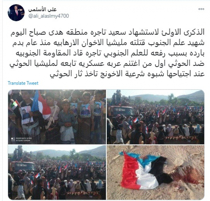 وأضاف: "شهيد علم الجنوب قتلته مليشيا الإخوان الإرهابية منذ عام بدم باردة بسبب رفعه للعلم الجنوبي".