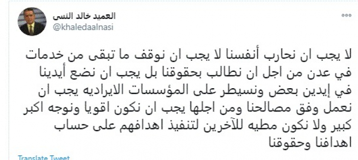 النسي يُطالب أبناء الجنوب بالسيطرة على المؤسسات الإيرادية