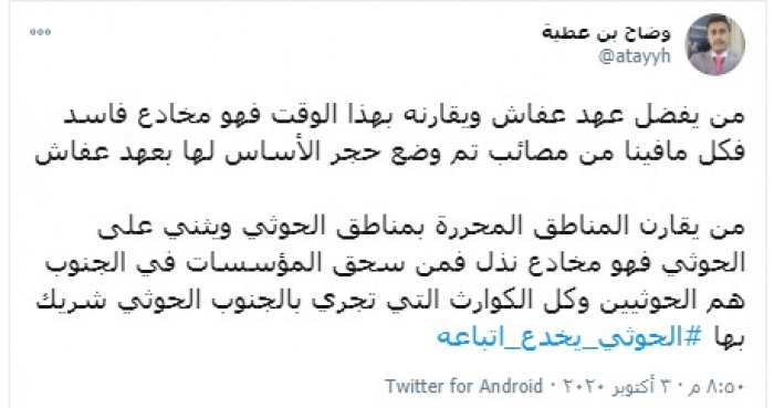 وكتب "بن عطية" تغريدة عبر تويتر، رصدها "المشهد العربي": "من يفضل عهد عفاش ويقارنه بهذا الوقت فهو مخادع فاسد فكل مافينا من مصائب تم وضع حجر الأساس لها بعهد عفاش".