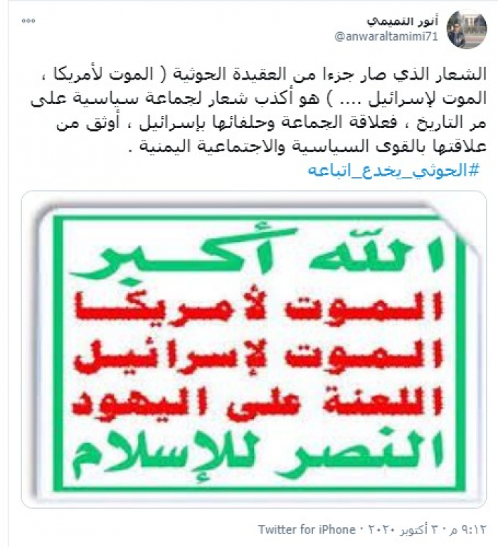 وكتب "التميمي" تغريدة عبر تويتر، رصدها "المشهد العربي": "الشعار الذي صار جزءا من العقيدة الحوثية ( الموت لأمريكا ، الموت لإسرائيل ..) هو أكذب شعار لجماعة سياسية على مر التاريخ".