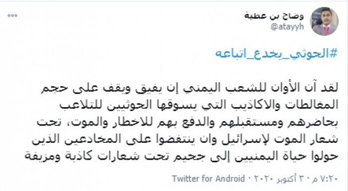 وكتب "بن عطية" تغريدة عبر تويتر، رصدها "المشهد العربي": "لقد آن الأوان للشعب اليمني أن يفيق ويقف على حجم المغالطات والأكاذيب التي يسوقها الحوثيون للتلاعب بحاضرهم ومستقبلهم والدفع بهم للأخطار والموت، تحت شعار الموت لإسرائيل وأن ينتفضوا على المخادعين الذين حولوا حياة اليمنيين إلى جحيم تحت شعارات كاذبة ومزيفة".