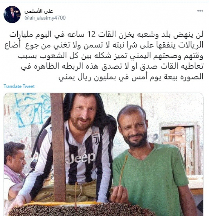 وكتب في تغريدة عبر "تويتر" رصدها "المشهد العربي": "لن ينهض بلد وشعبه يخزن القات 12 ساعة في اليوم مليارات الريالات ينفقها على شرَ نبتة لا تسمن ولا تغني من جوع أضاع وقتهم وصحتهم".