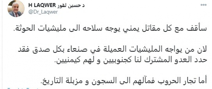وقال في تغريدة عبر "تويتر" رصدها "المشهد العربي": "سأقف مع كل مقاتل يمني يوجه سلاحه إلى مليشيات الحوثة".