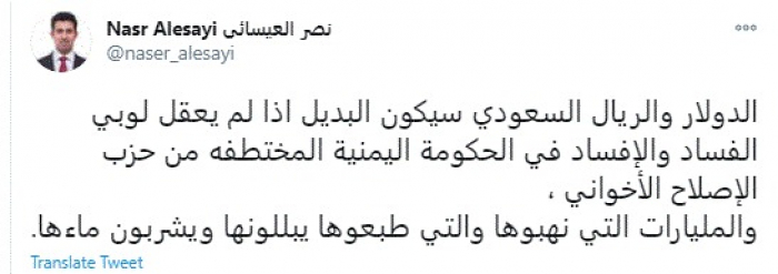 وقال في تغريدة عبر "تويتر" رصدها "المشهد العربي": "الدولار والريال السعودي سيكون البديل إذا لم يعقل لوبي الفساد والإفساد في الحكومة اليمنية المختطفة من حزب الإصلاح الإخواني، والمليارات التي نهبوها والتي طبعوها يبللونها ويشربون ماءها".