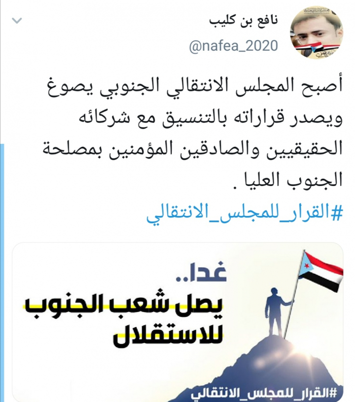 وقال كليب في تغريدة له عبر حسابه بتويتر ورصدها "المشهد العربي": "أصبح المجلس الانتقالي الجنوبي يصوغ ويصدر قراراته بالتنسيق مع شركائه الحقيقيين والصادقين المؤمنين بمصلحة الجنوب العليا".