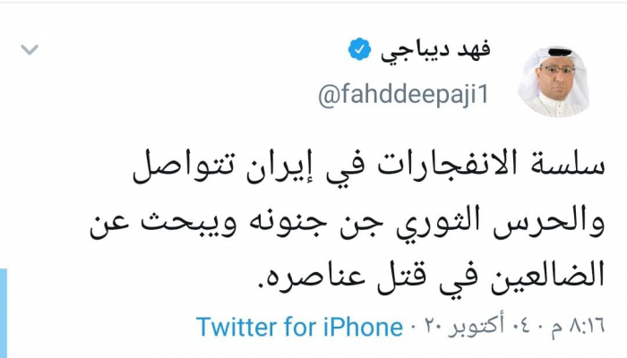 وغرد ديباجي عبر حسابه في تويتر ورصدها "المشهد العربي" قائلاً: "سلسة الانفجارات في إيران تتواصل، والحرس الثوري جن جنونه ويبحث عن الضالعين في قتل عناصره".