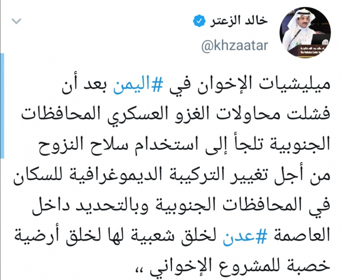 وكتب الزعتر عبر تغريدة له على "تويتر" رصدها "المشهد العربي": "مليشيات الإخوان في اليمن بعد أن فشلت محاولات الغزو العسكري المحافظات الجنوبية تلجأ إلى استخدام سلاح النزوح من أجل تغيير التركيبة الديموغرافية للسكان في المحافظات الجنوبية وبالتحديد داخل العاصمة عدن لخلق شعبية لها لخلق أرضية خصبة للمشروع الإخواني" .