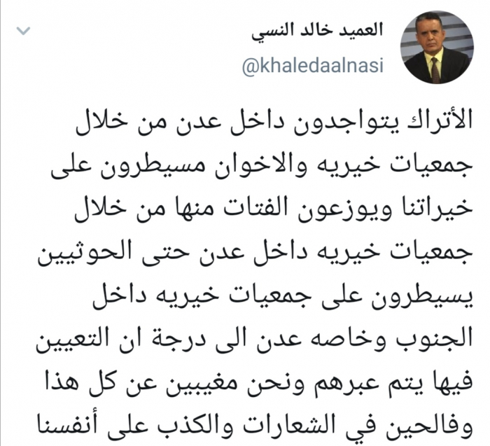 وقال النسي في تغريدة له عبر حسابه بتويتر ورصدها "المشهد العربي": الأتراك يتواجدون داخل عدن من خلال جمعيات خيرية والإخوان مسيطرون على خيراتنا ويوزعون الفتات منها من خلال جمعيات خيرية داخل عدن".