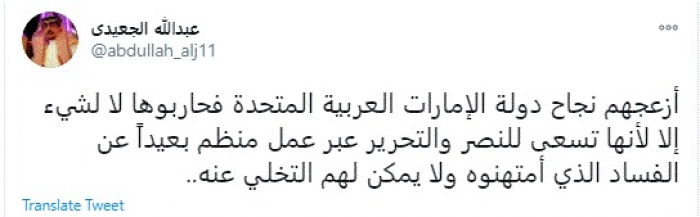 وقال في تغريدة عبر "تويتر" رصدها "المشهد العربي": "أزعجهم نجاح دولة الإمارات العربية المتحدة فحاربوها لا لشيء إلا لأنها تسعى للنصر والتحرير عبر عمل منظم بعيدًا عن الفساد الذي أمتهنوه ولا يمكن لهم التخلي عنه".