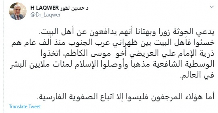 وقال في تغريدة عبر "تويتر" رصدها "المشهد العربي": "يدعي الحوثة زورًا وبهتانًا أنهم يدافعون عن أهل البيت".