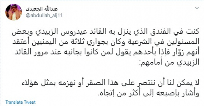 وقال في تغريدة عبر "تويتر" رصدها "المشهد العربي": "كنت في الفندق الذي ينزل به القائد عيدروس الزُبيدي وبعض المسئولين في الشرعية وكان بجواري ثلاثة من اليمنيين أعتقد أنهم زوّار فإذا بأحدهم يقول لمن كانوا بجانبه عند مرور القائد الزُبيدي من أمامهم: لا يمكن لنا أن ننتصر على هذا الصقر أو نهزمه بمثل هؤلاء وأشار بإصبعه إلى أكثر من اتجاه".