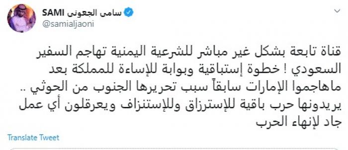 وقال في تغريدة عبر "تويتر" رصدها "المشهد العربي": "قناة تابعة بشكل غير مباشر للشرعية اليمنية تهاجم السفير السعودي! خطوة استباقية وبوابة للإساءة للمملكة بعد ما هاجموا الإمارات سابقًا سبب تحريرها الجنوب من الحوثي".